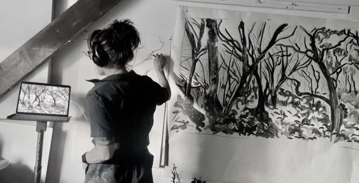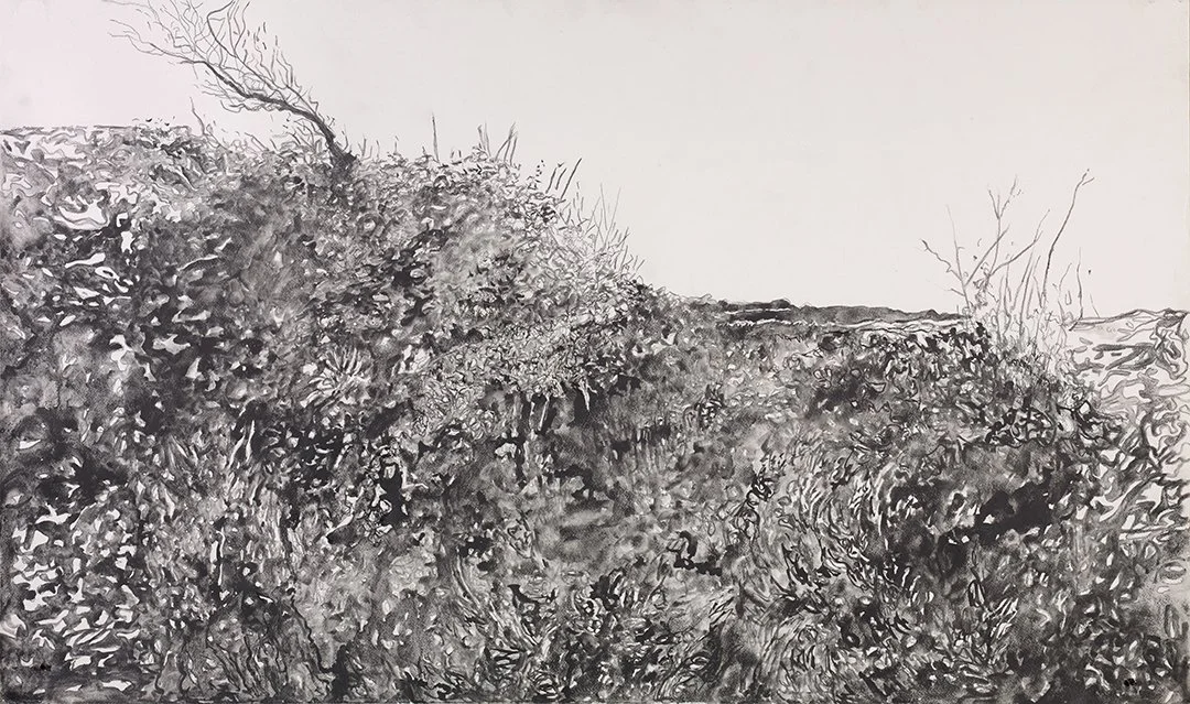 The materials I use are water-soluble graphite on watercolor paper. The quality of this material allows for a gestrual movement between precise mark-making and the fluidity of water, conveying both the sharp detail and the flowing motion of open observation. The graphite holds a rich, warm, greasy black quality, creating a safe and inviting haven to walk into and explore memory imprints beyond place and time.
